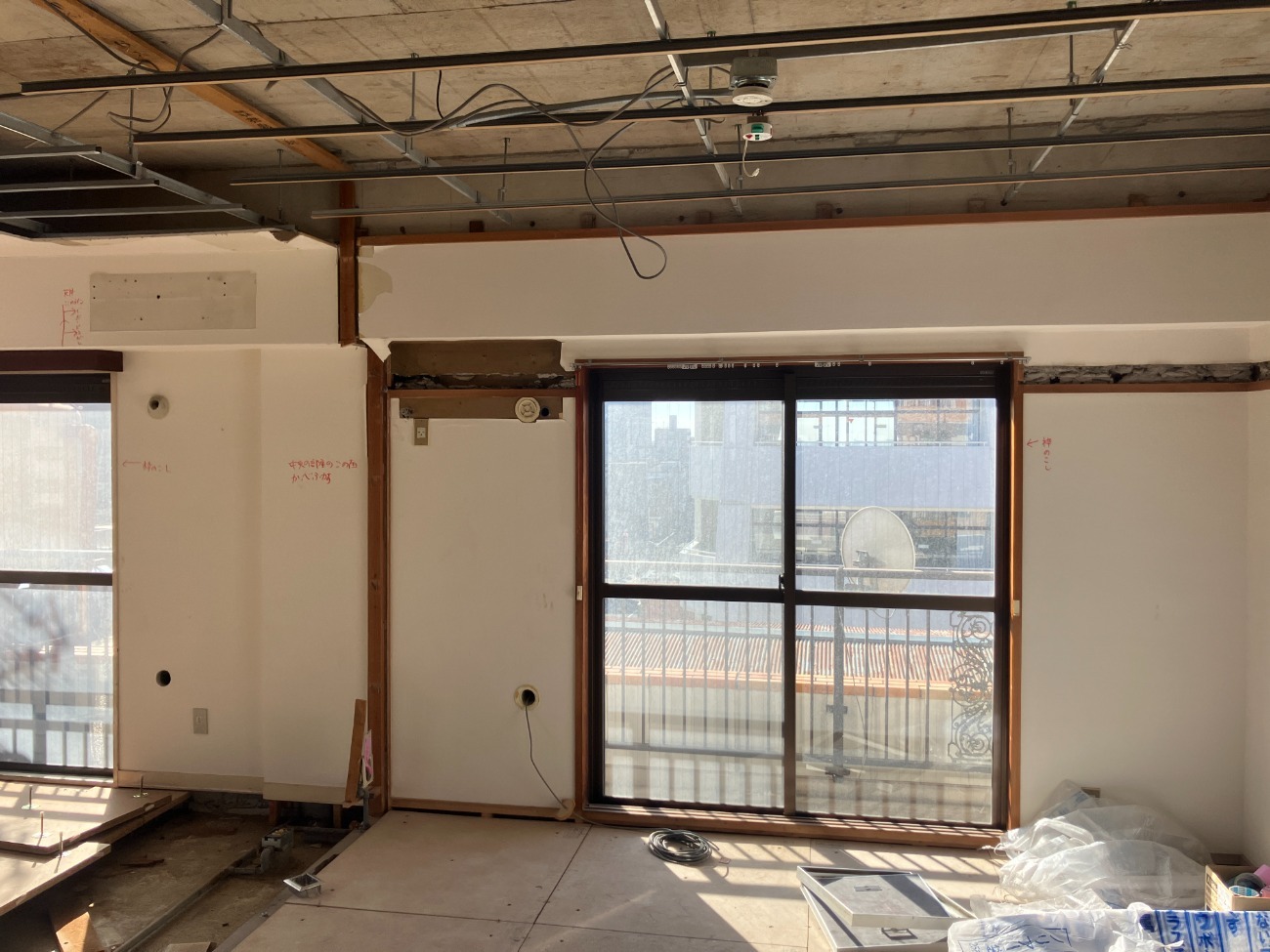 マンションは戸建てと違う部分もあったりとお伝えしましたが、その一つが壁や天井の下地です。こちらの写真の天井下地は【軽天・軽量鉄骨・LGS】などと言われている、金属製の下地が多いです。戸建ては主に木造(最近の新築は軽天を使用しているところもあります)なので、その構造や施工方法は大きく異なります。